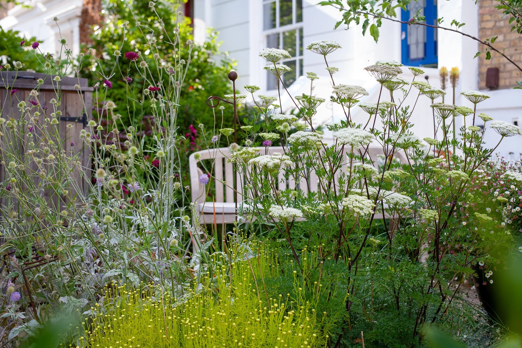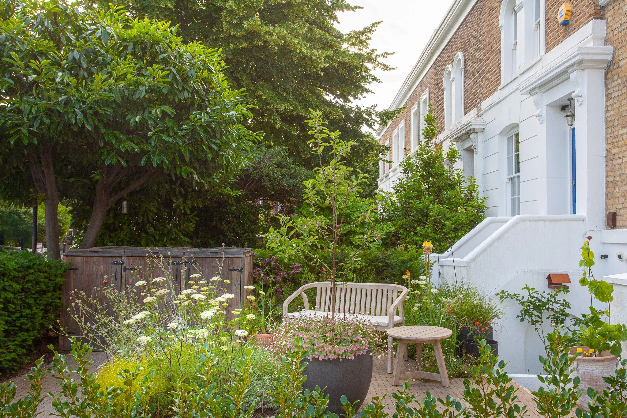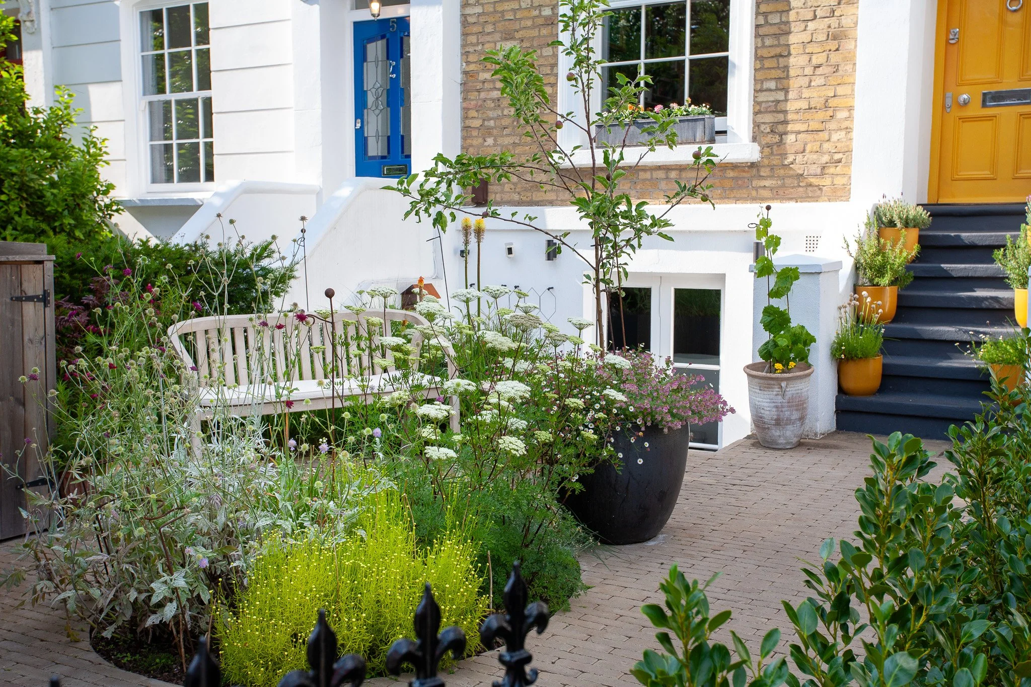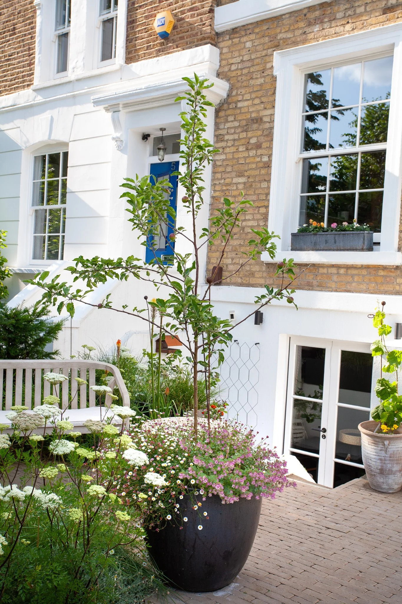 The paving was entirely replaced with new clay pavers laid on a permeable sub base so that all of the rain goes back into the ground, saving the ancient London sewers and creating better soil conditions for the planting.