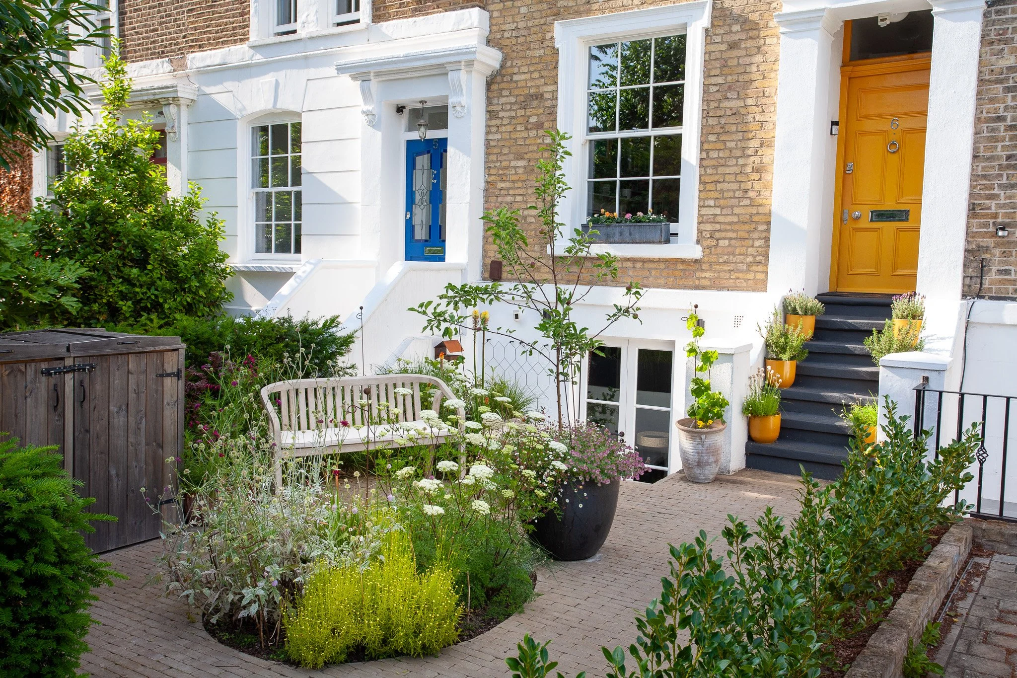 This front garden to a handsome Victorian Townhouse previously did not do justice to the architecture. My client wanted to neaten it up, removing the jumble of paving materials and overgrown plants. They also wanted to grow more sun loving plants than they can in their small north facing rear garden and to have a small seating space to enjoy them.